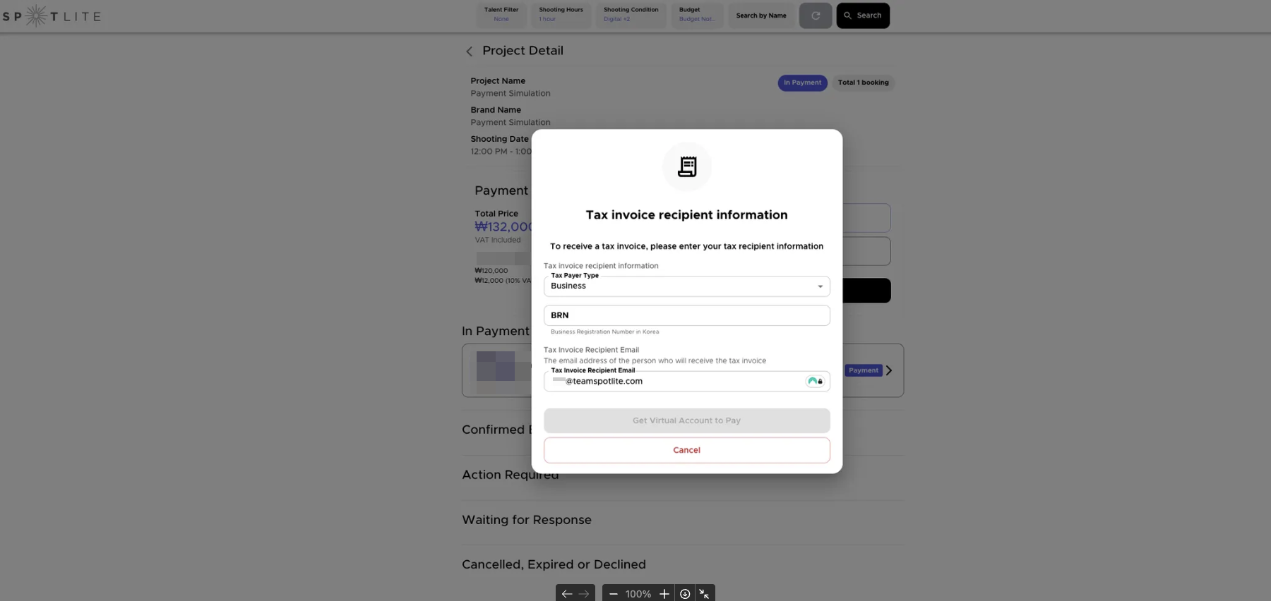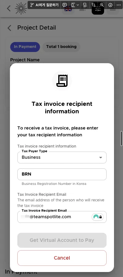 4. For virtual account payments, a tax invoice can be issued if you provide a business registration number. If you do not have a business registration certificate, a cash receipt can be issued instead.